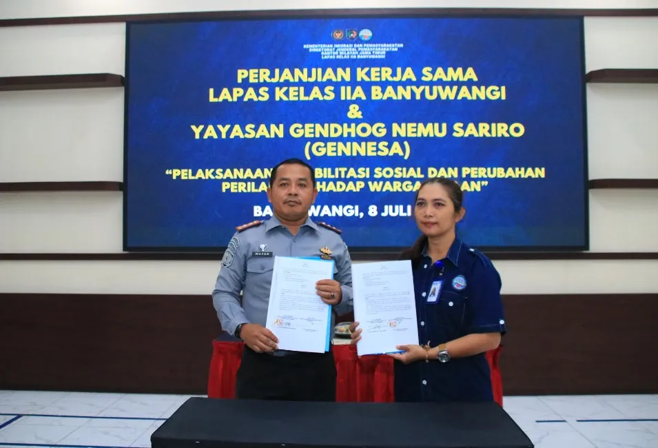 Banyuwangi1tv.com – Lembaga Pemasyarakatan (Lapas) Kelas IIA Banyuwangi resmi menjalin kerja sama dengan Yayasan Gendhog Nemu Sariro (GENNESA) Banyuwangi dalam pelaksanaan program rehabilitasi sosial bagi warga binaan, khususnya mereka yang tersandung kasus penyalahgunaan narkotika. Penandatanganan perjanjian dilakukan pada Selasa (8/7/2025) pagi di Aula Sahardjo Lapas Banyuwangi.